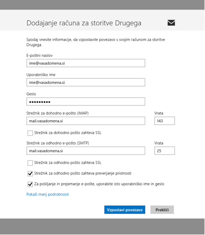 Preden začnete z nastavljanjem poštnega predala v Windows 8 odjemalcu preverite da: