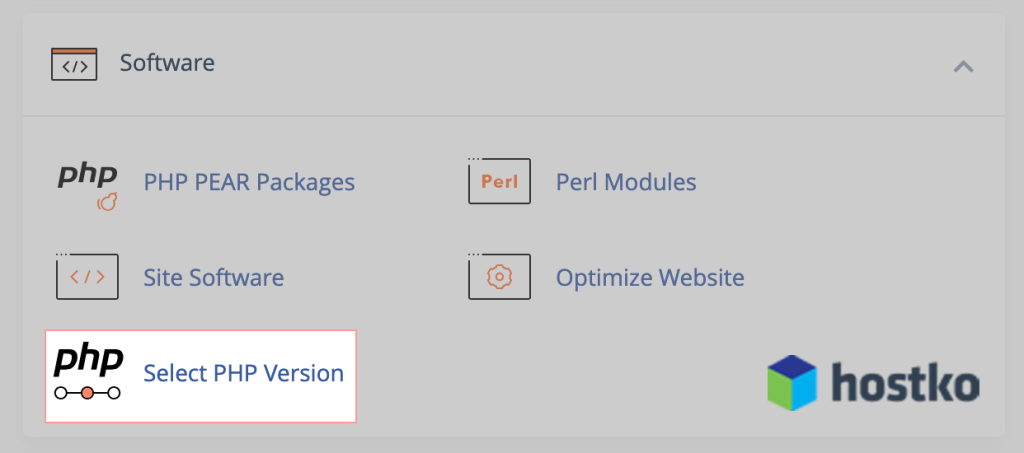 Poiščite razdelek SOFTWARE in kliknite na Select PHP Version.