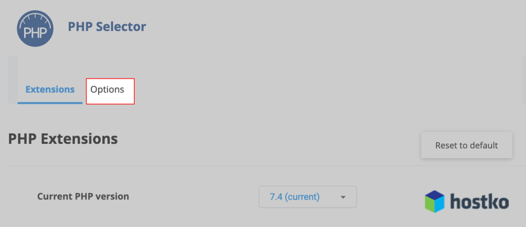 Kliknite na povezavo “Options” ali “Switch to PHP Options” (odvisno od različice cPanela).